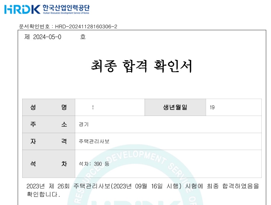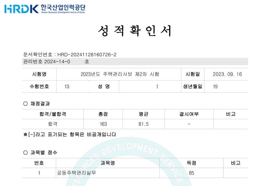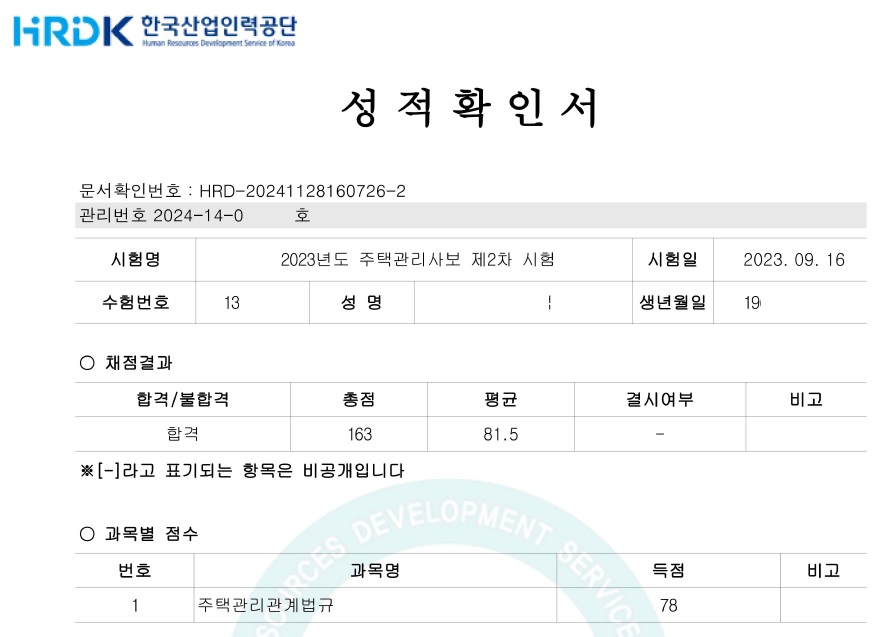 드디어 시험날짜가 되어 주택관리사보 2차 시험을 봤고, 결과는 합격입니다. 관계법규 78점, 관리실무 85점, 평균 81.5점으로 석차는 390등입니다.