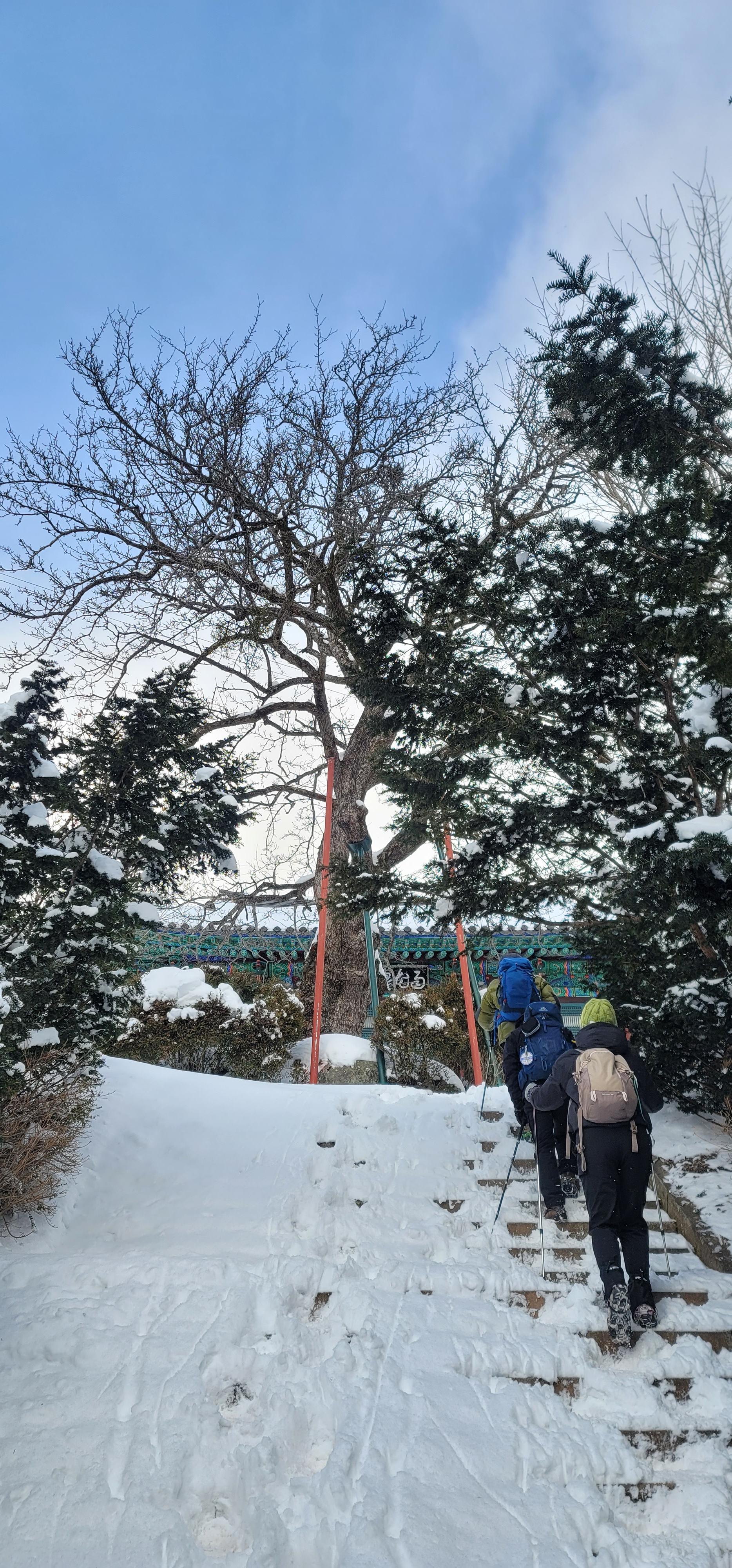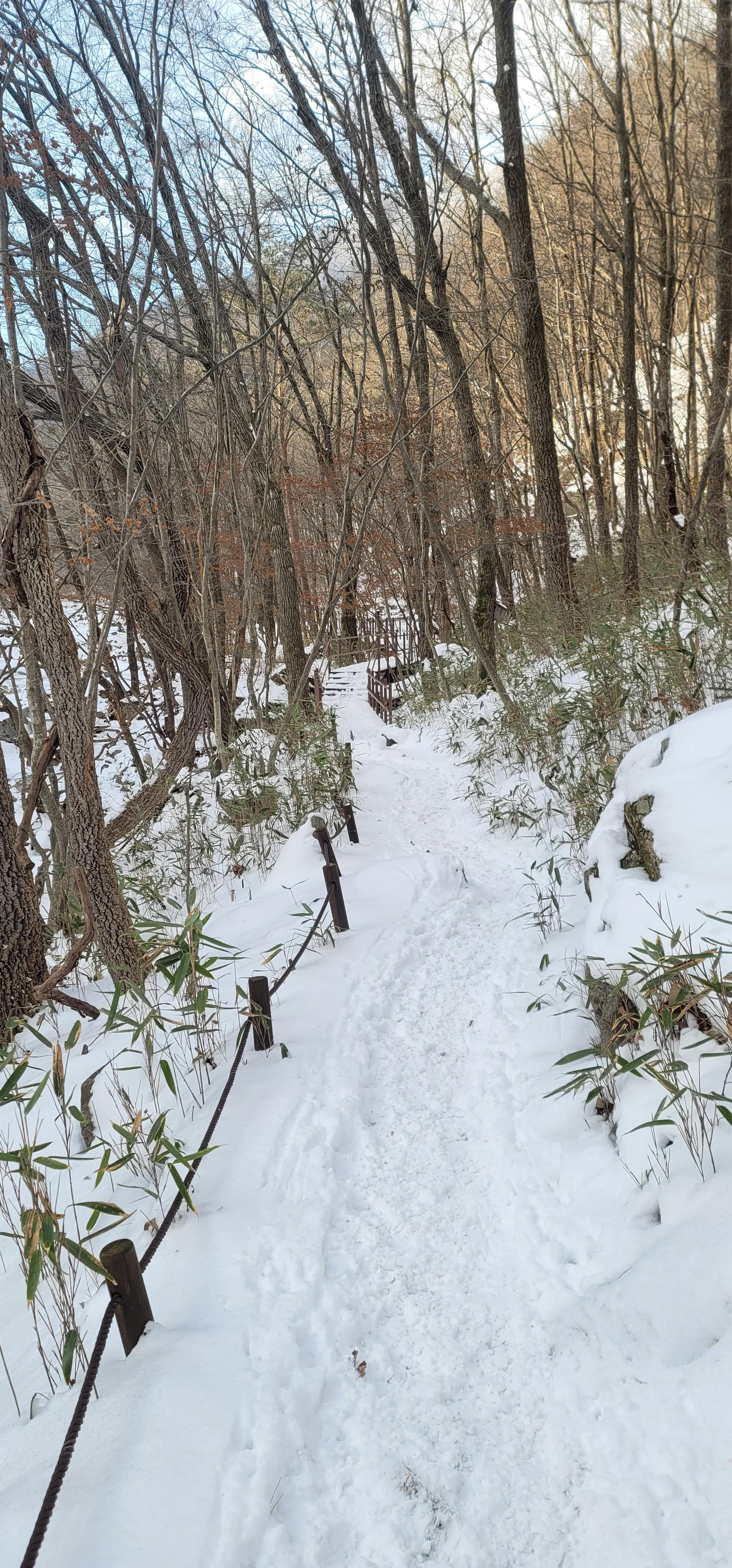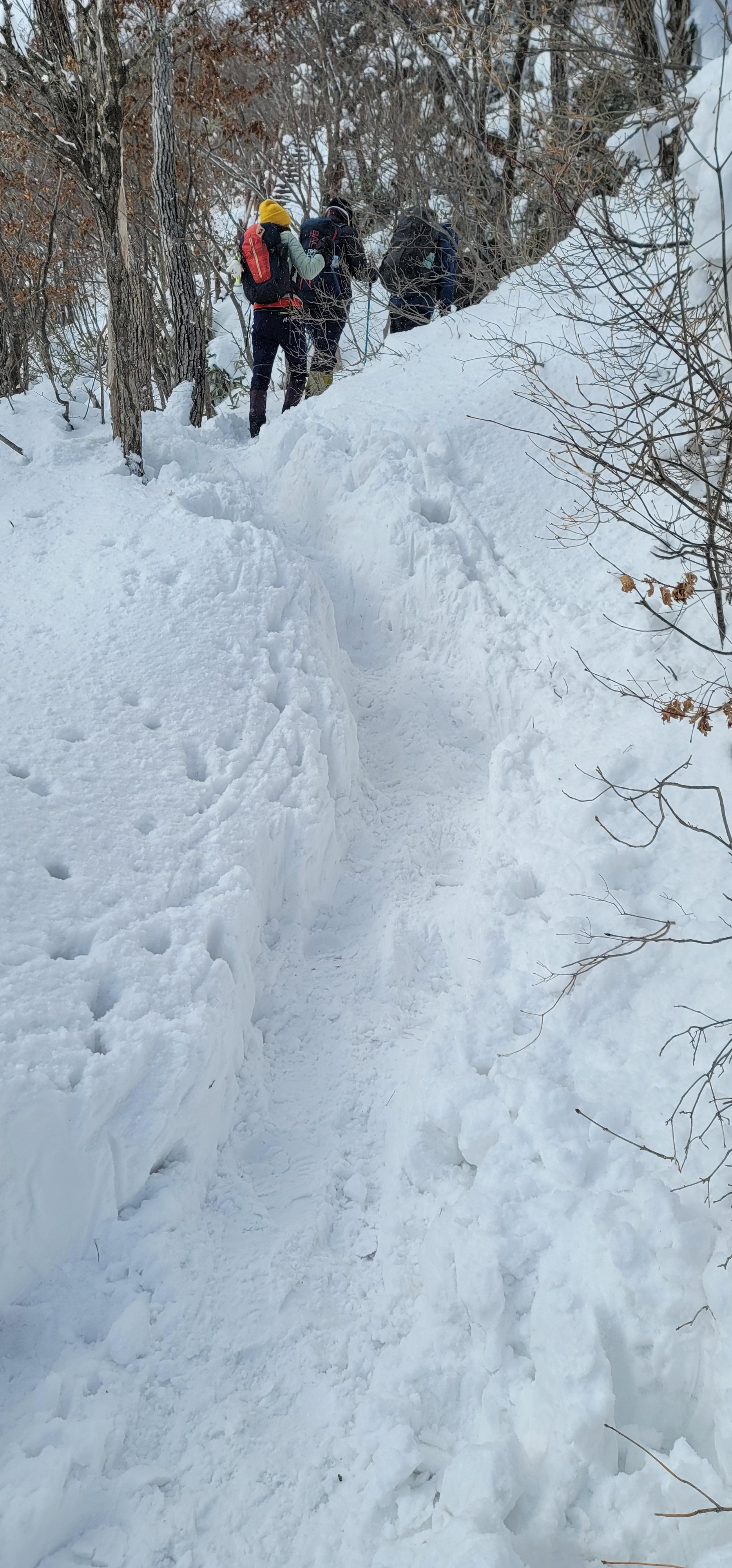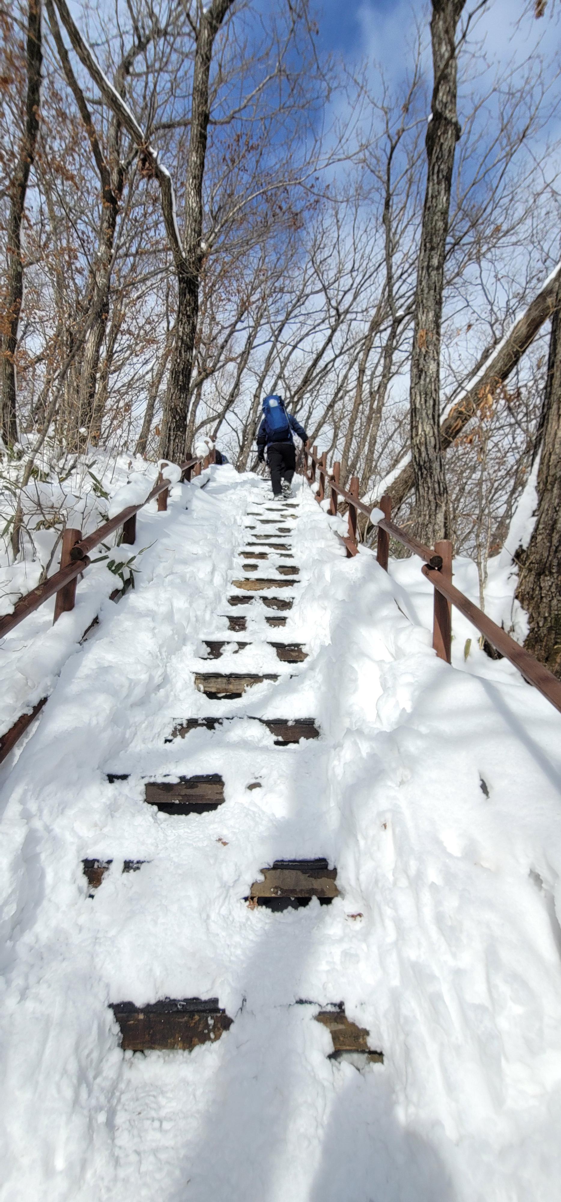 - 코스 특징 : 눈이 엄청 많이 쌓여 있어 일렬로 줄지어서 산행해야 되고, 하산하시는 분들과 마주치면 길을 비켜주다가 눈에 빠지기도 함
