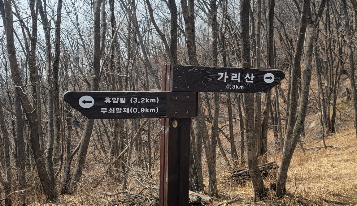- 등산 코스 : 가리산 자연휴양림 제1주차장 ~ 강우레이더관측소 ~ 무쇠말재 ~ 가리산정상 ~ 가삽고개 ~ 새득이봉 - 제1주차장